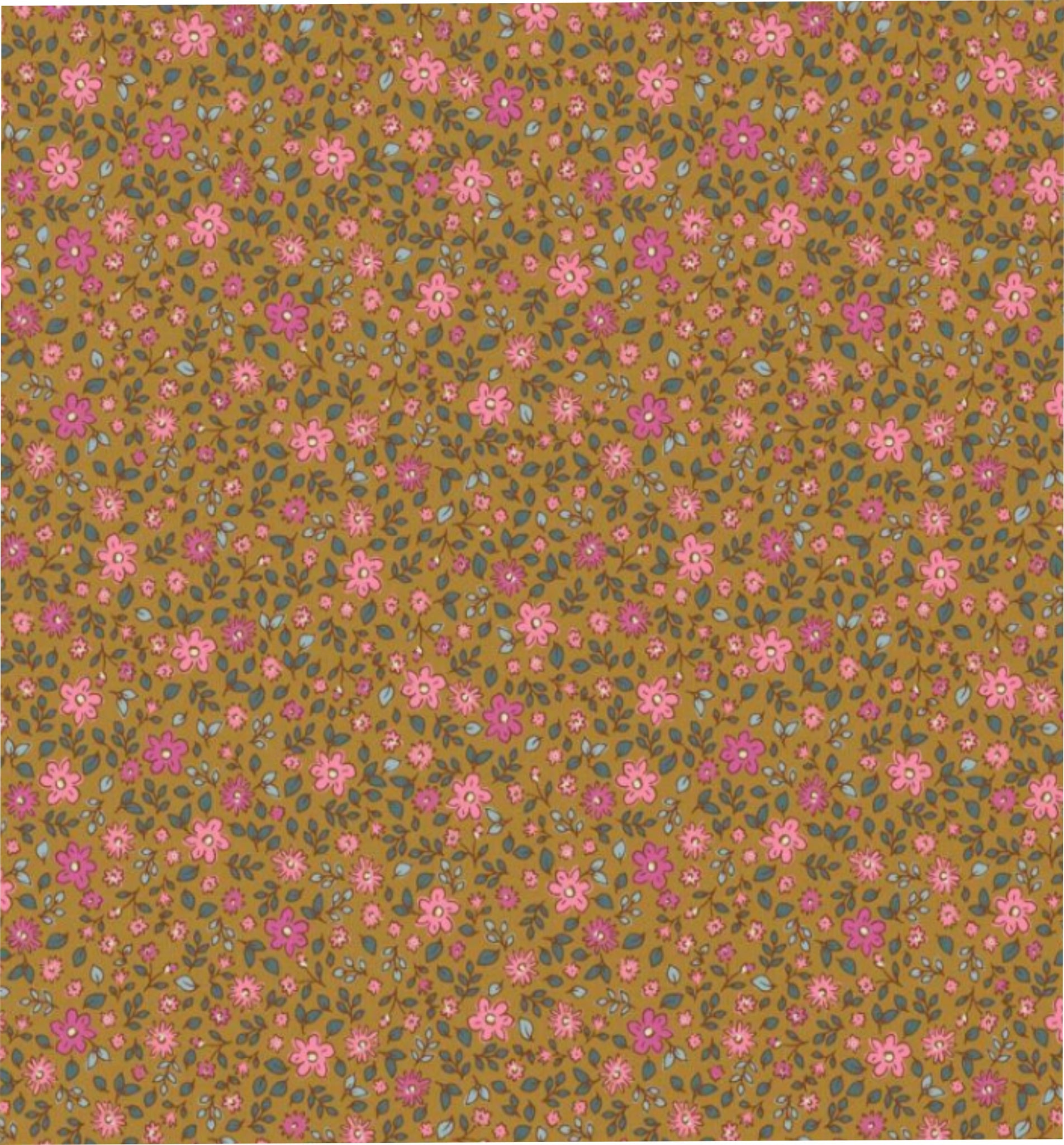 Tissu Popeline Coton – Motif Fleurs Havane et Rose