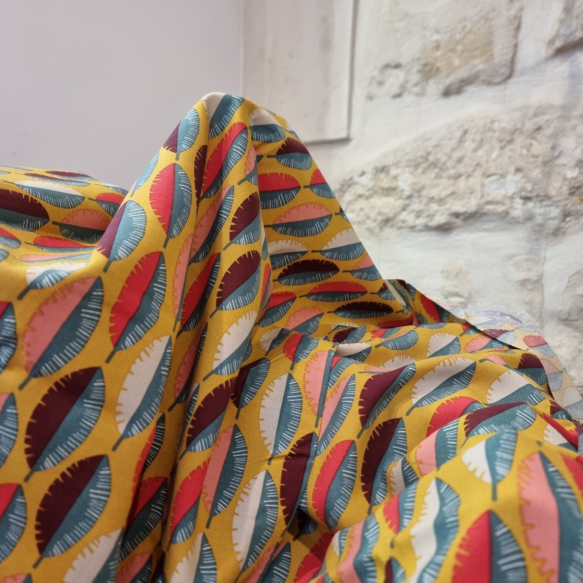 Succombez au charme de cette popeline en 100% coton, ornée d’un motif de feuilles dans des tons retro. Une matière légère, douce et fluide, parfaite pour toutes vos créations vestimentaires et d’accessoires.
