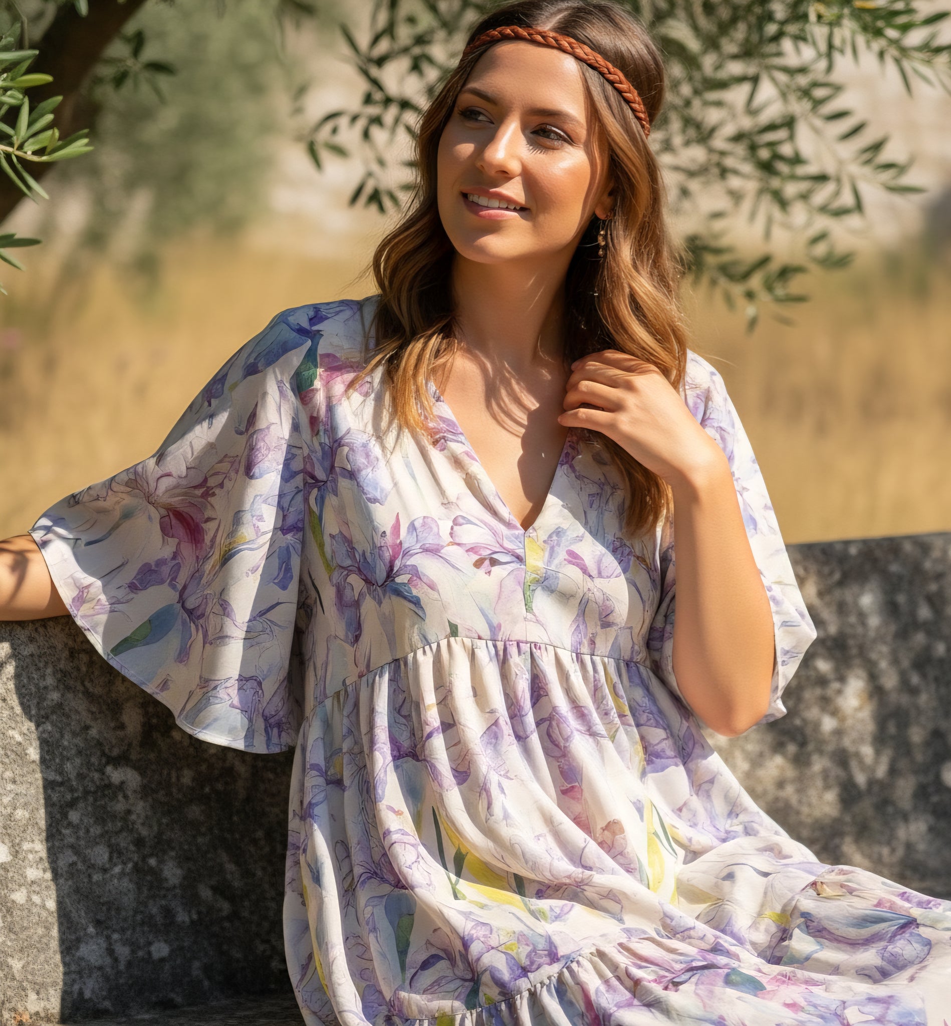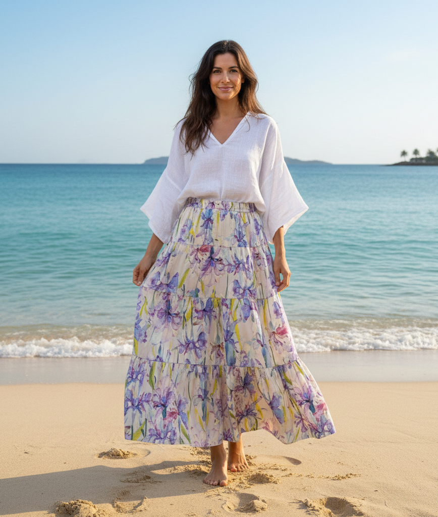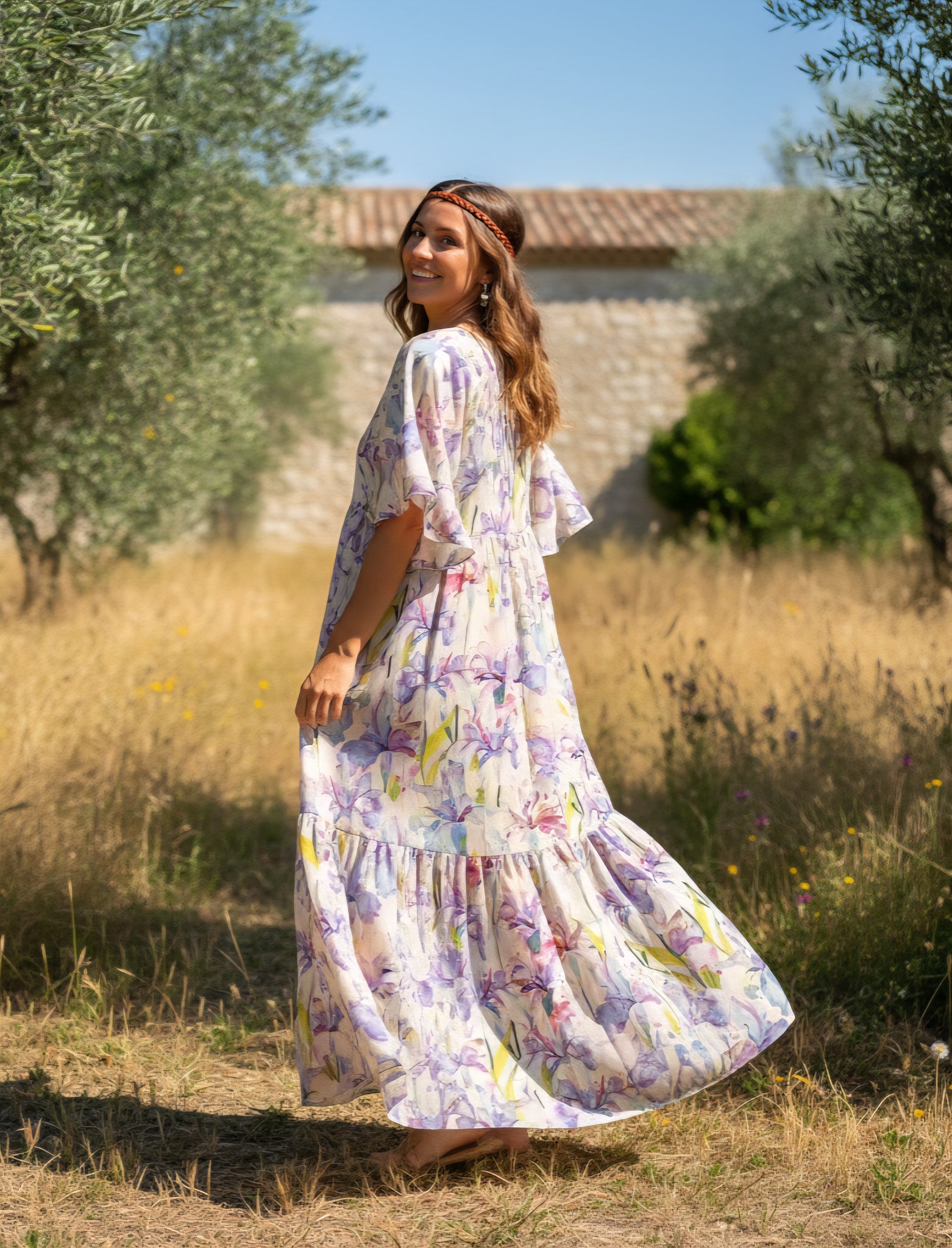 Ce tissu excelle pour des robes longues bohèmes provençales (comme sur nos photos : vue dos avec manches évasées, vue face kimono), blouses légères à encolure V, débardeurs d'été, jupes plissées fluides, pantalons palazzo amples ou robes trapèze aériennes. Son drapé naturel sublime les coupes droites ou évasées, idéal pour sublimer vos créations DIY estivales et bohèmes. Prélavez toujours avant couture pour un résultat optimal !