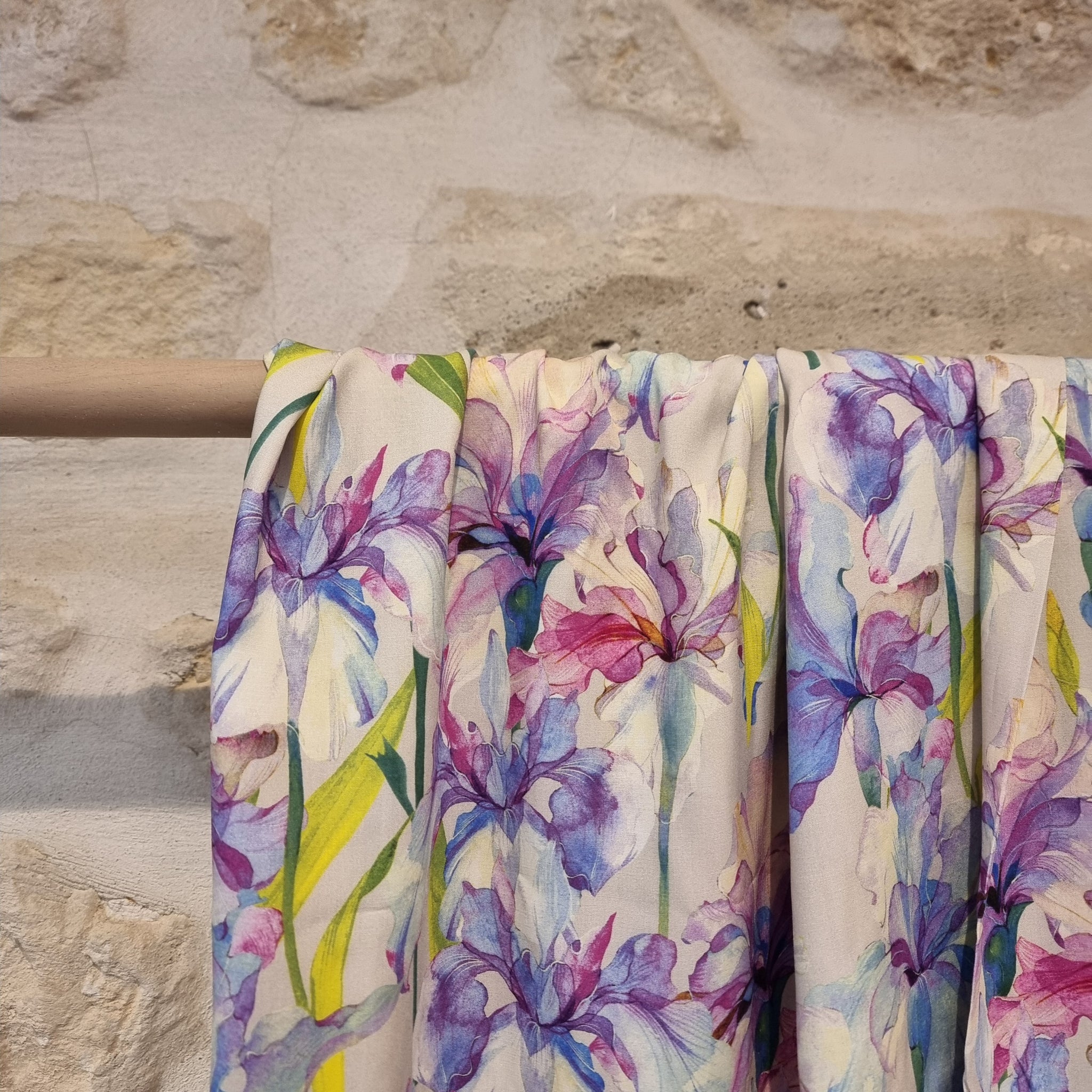 Découvrez notre tissu viscose fluide au mètre OEKO-TEX avec motif fleurs aquarelle iris rose bleu violet sur fond écru ! Parfait pour coudre des robes bohèmes légères, blouses aériennes, débardeurs fluides ou pantalons souples. Ce tissu 100% viscose ultra-léger (110g/m²), chaîne et trame non-stretch, offre un drapé soyeux exceptionnel, proche de la soie, sans transparence – doublure inutile pour les hauts. Label OEKO-TEX 100 certifié, sécurisé et sain.